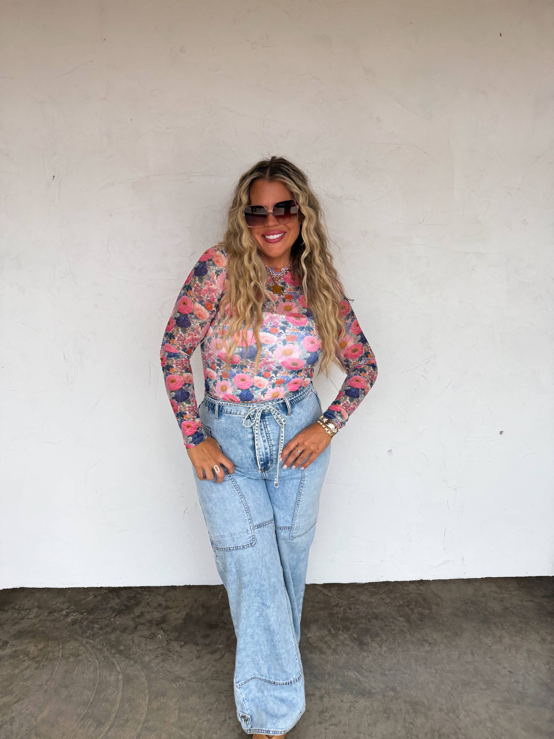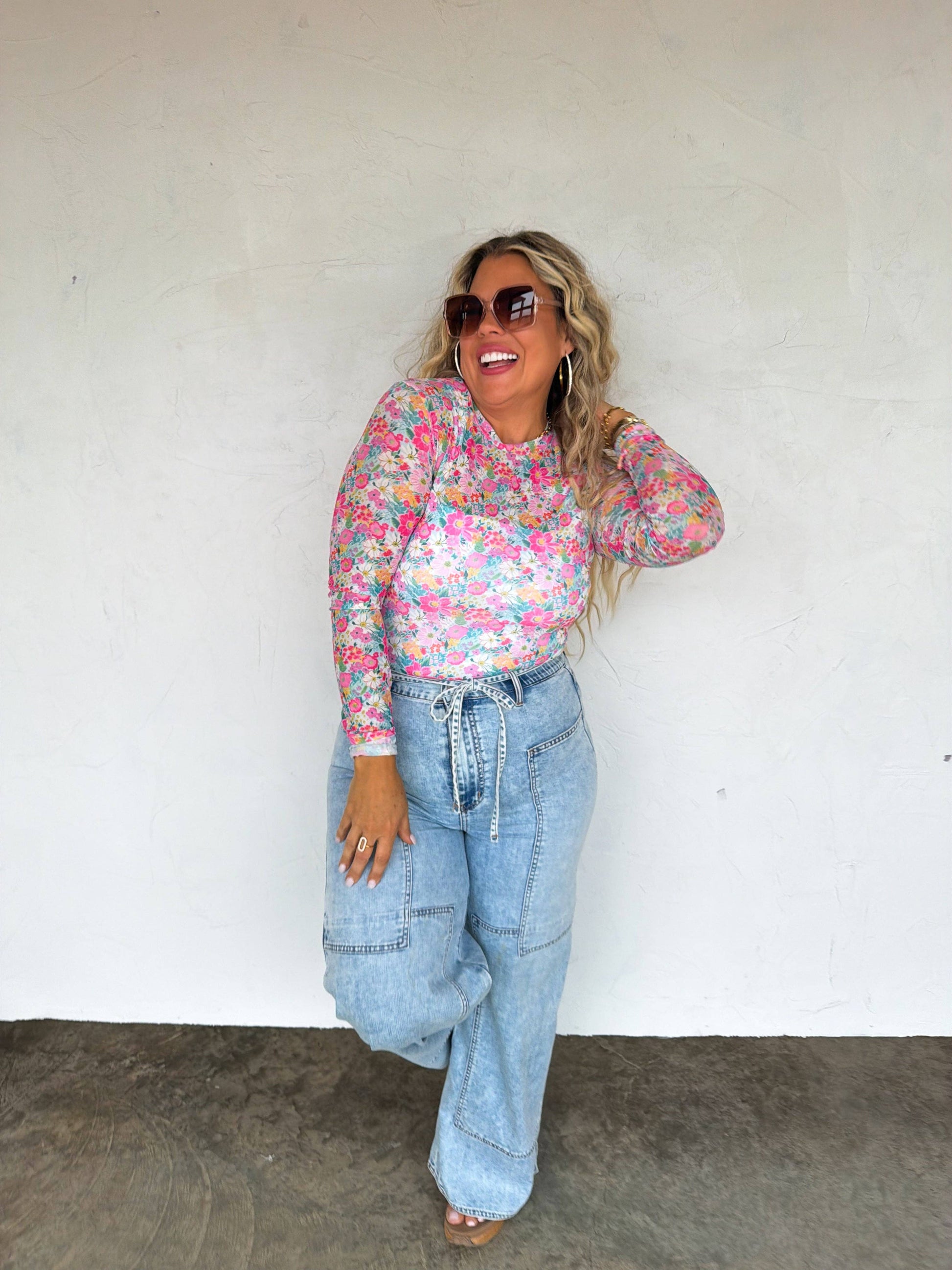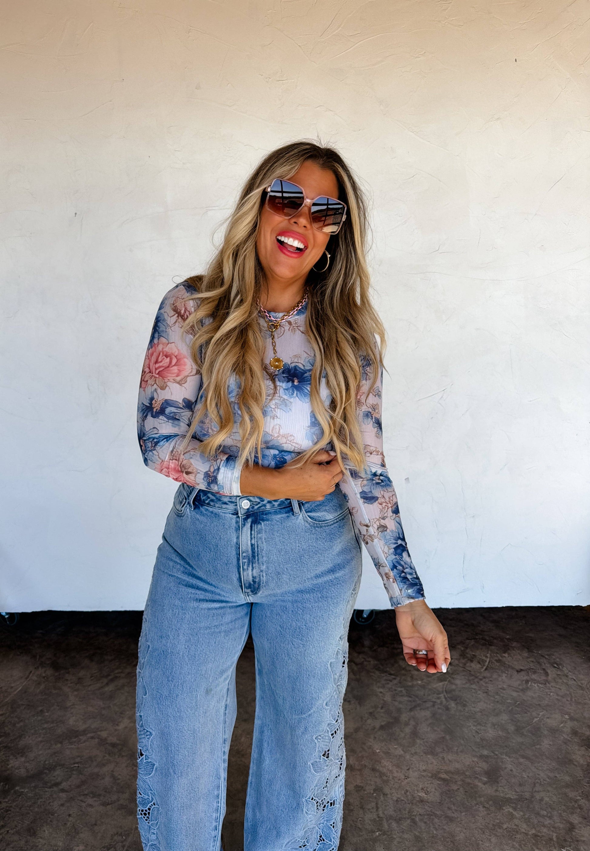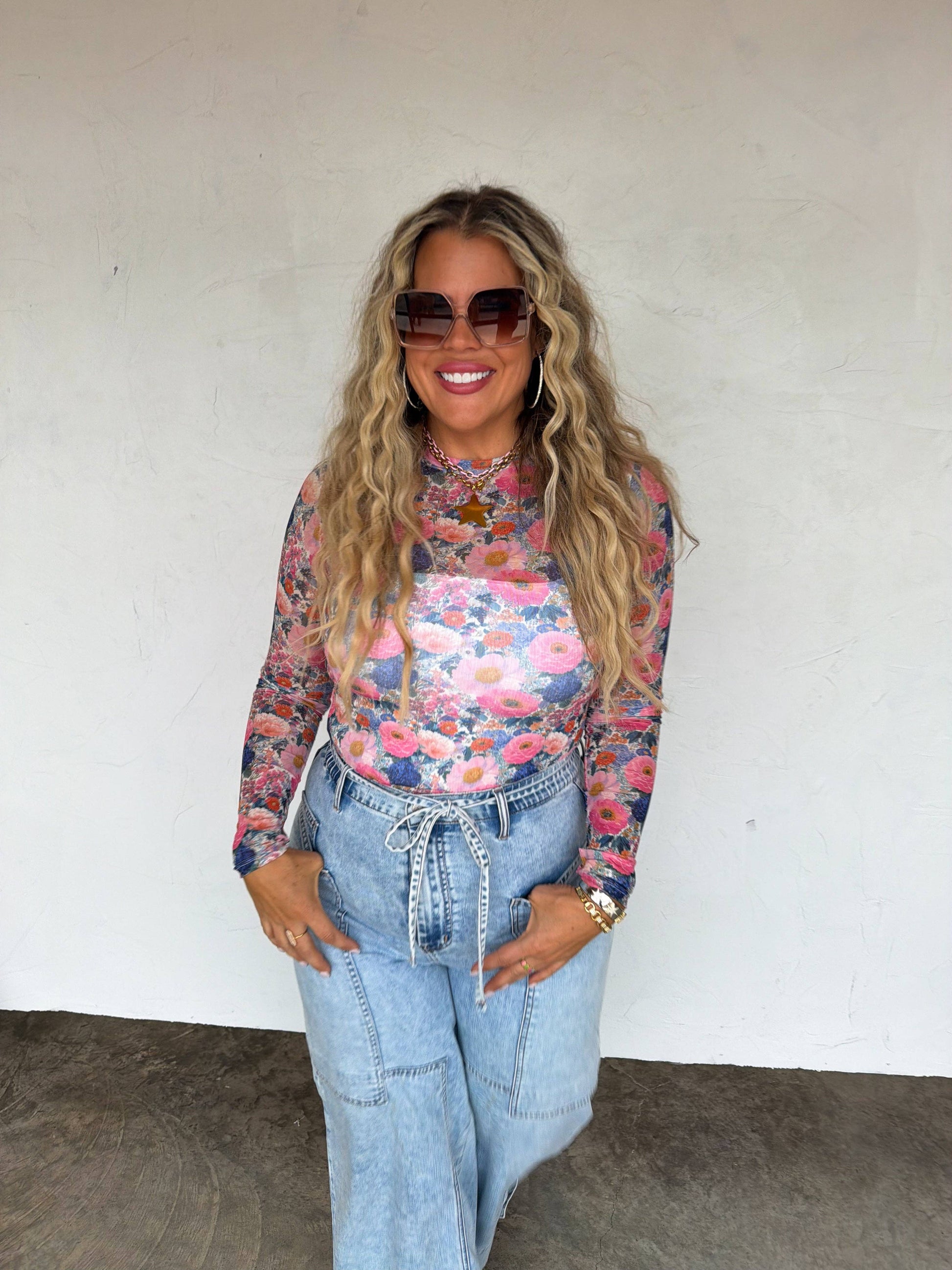 Super cute for layering, this sultry stretchy mesh print long-sleeve top features a totally sheer design. Perfect worn alone or paired under your favorite cardigan, vest or sweater! Crew neck and thumbhole details.