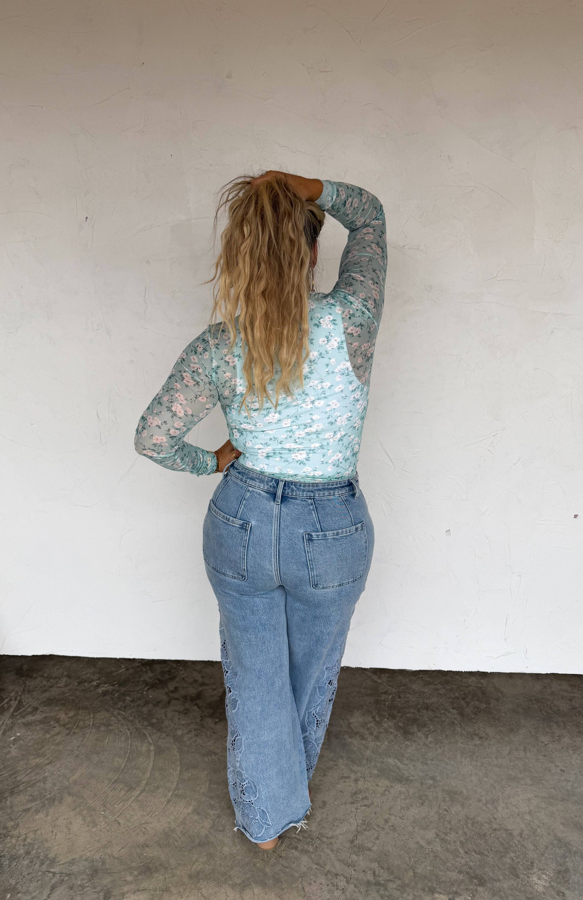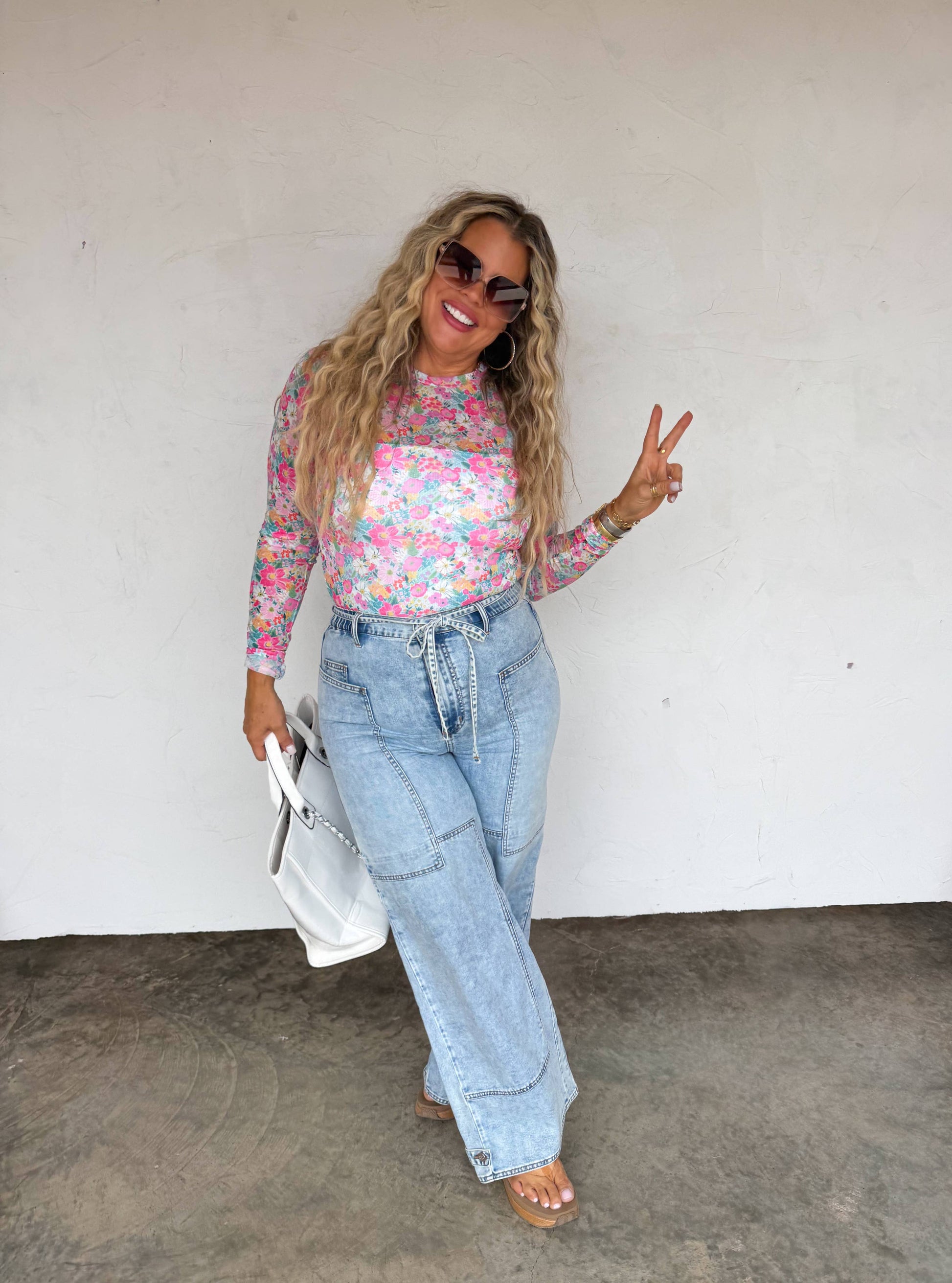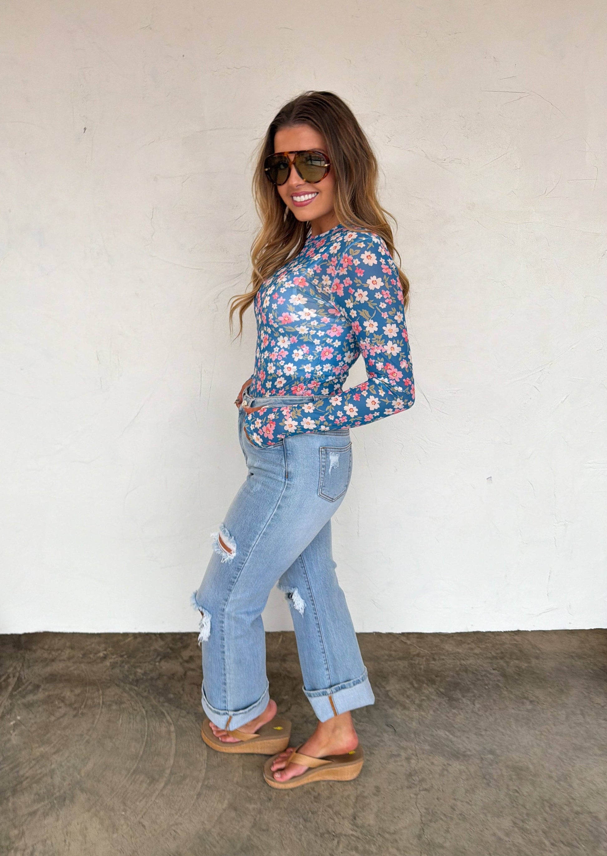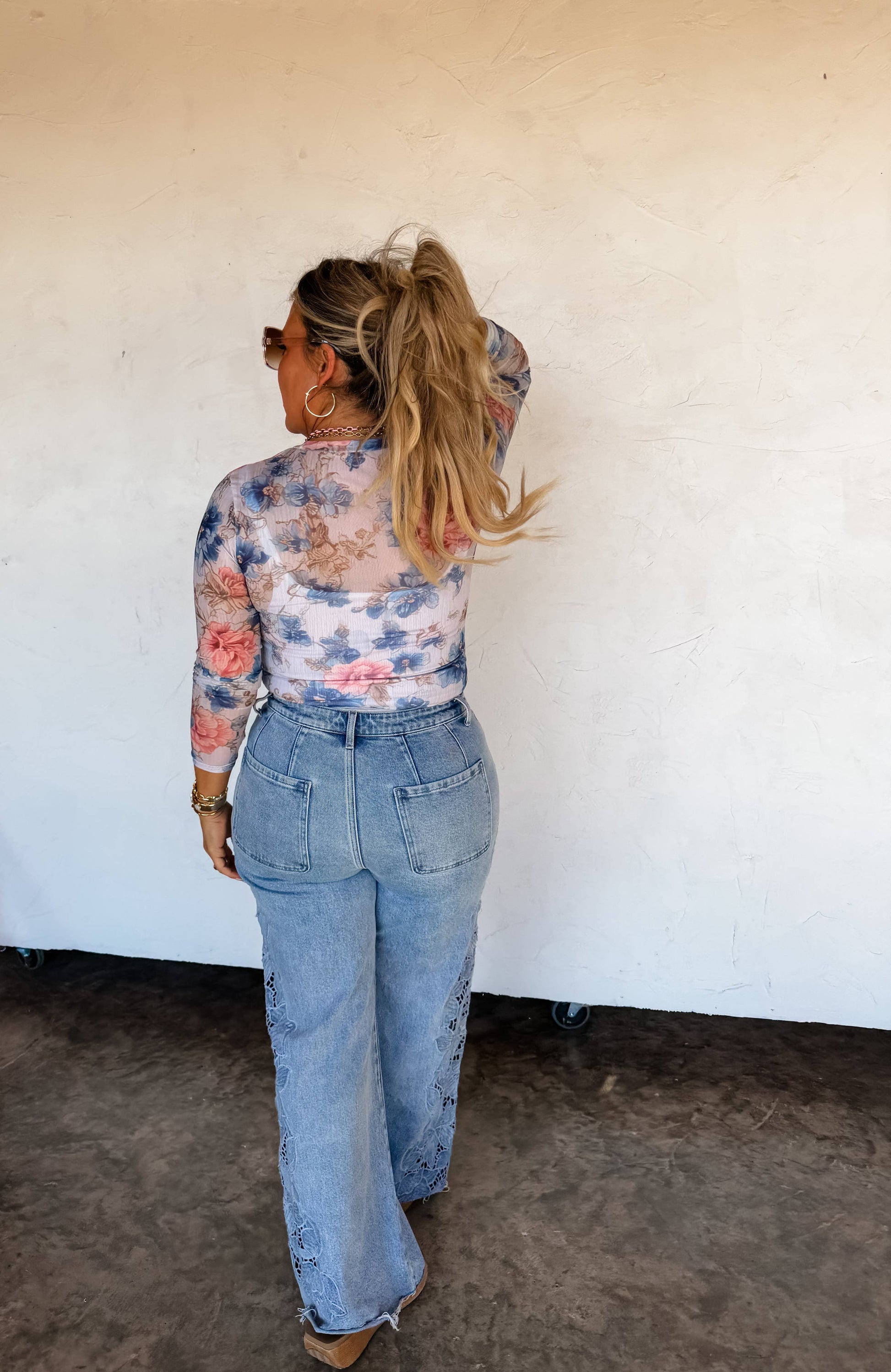 Super cute for layering, this sultry stretchy mesh print long-sleeve top features a totally sheer design. Perfect worn alone or paired under your favorite cardigan, vest or sweater! Crew neck and thumbhole details.